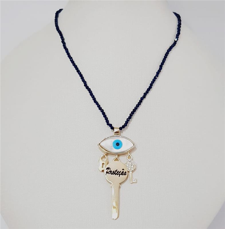 Corrente C/Ping. Fol. Dourado Pedra Cristal Bulg. Azul Chave Protecao/ Madreperola Olho Grego